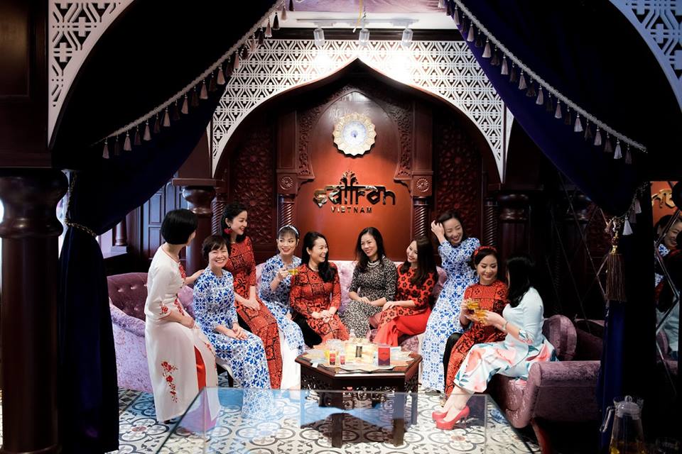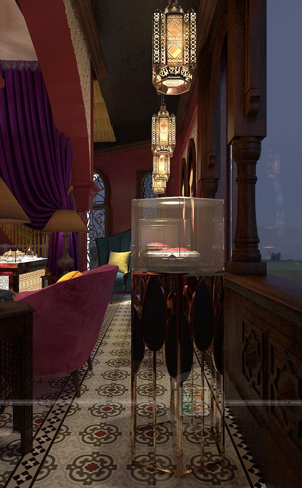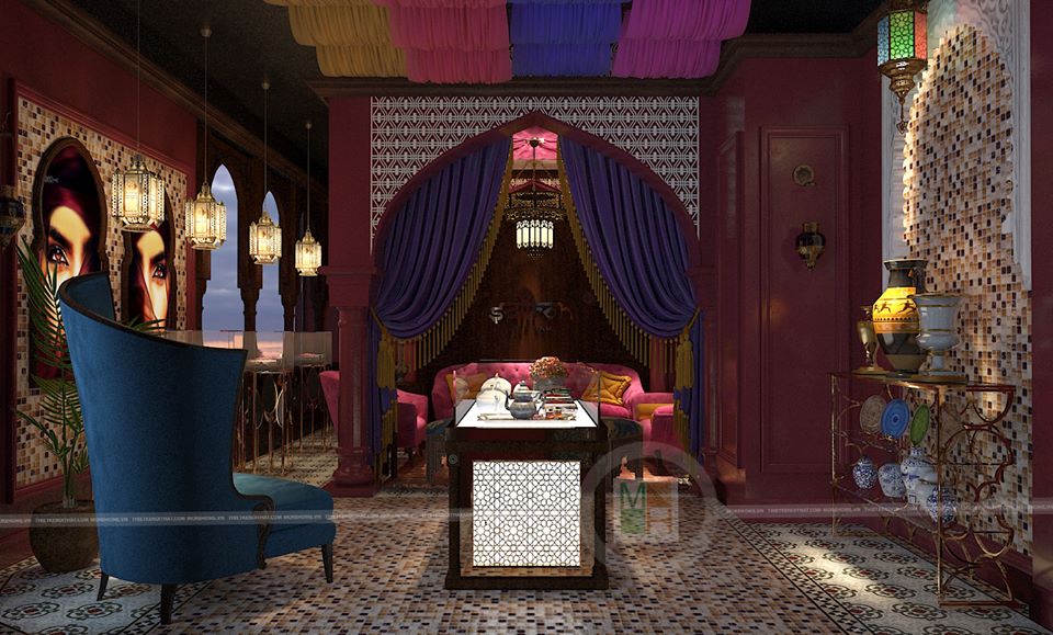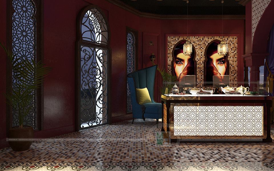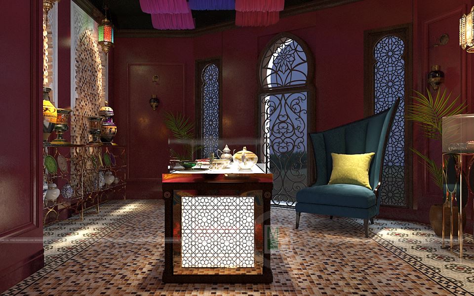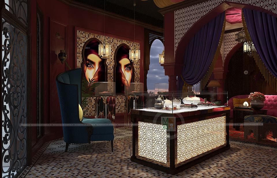 Bên cạnh đó, các vật dụng trang trí nội thất như ghế sofa, rèm cửa hay kệ trưng bày đều mang nét đặc trưng riêng biệt cho cửa hàng. Chất liệu nhung quý phái được sử dụng cho bộ ghế sofa to rộng, mang lại cảm giác thoải mái, dễ chịu cho gia chủ, nhung cũng là chất liệu trang trí thể hiện sự quyền uy, cổ điển. Các rèm cửa được thêm vào các chi tiết viền treo tua rua độc đáo thể hiện nét đẹp Tây Á từ những điều nhỏ nhất. Khung đèn trang trí cũng được lựa chọn kỹ lưỡng từ màu sắc, kiểu dáng đền cường độ ánh sáng từ đó giúp không gian trở nên cân bằng, hài hòa.
