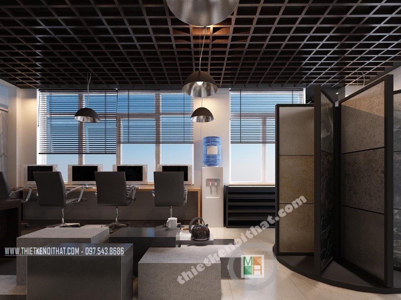 Một trong những đặc điểm nổi bật của showroom này chính là thiết kế trần cách tân độc đáo. Với thiết kế thông thường, kiến trúc sư thường sử dụng tường thô với màu sơn đơn sắc, có khi thiết kế lại được điểm xuyết hay thay đổi bằng thiết kế trần âm tường giúp cân bằng độ sáng. Riêng với thiết kế này, kiến trúc sư sử dụng trần gỗ theo chia ô nhỏ tạo độ thoáng cho trần và giúp tạo điểm nhấn cho showroom và mang đến sự thú ví cũng như hứng thú cho khách hàng. Thiết kế đèn đơn thuần khá nhàm chán vì vậy mà những chiếc đèn nhỏ với ánh sáng vừa phải sẽ là yếu tố giúp không gian trở nên hài hòa, không quá chói sáng nhưng cũng không làm không gian trở nên tối tăm mà lại gây hiệu ứng tốt về thẩm mỹ.